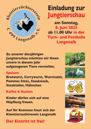 Der Kleintierzuchtverein Langenalb lädt zu seiner diesjährigen Jungtierschau in der Turn- und Festhalle Langenalb am 08.06.2025 ein.